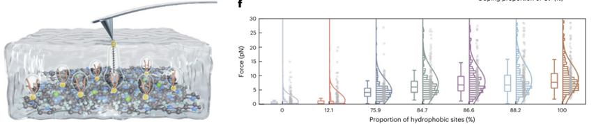 同时,能谱分析平台利用多功能单分子力谱仪(AFM),通过液相环境中的粘附力测试与开尔文探针显微镜表征,直接测量并验证了膜表面疏水力和静电位点的存在与可调控性。液相AFM粘附力测试结果显示,随着AOT掺杂比例增加,膜表面与疏水探针之间的粘附力显著增强,直接证实了AOT对疏水相互作用的贡献;开尔文探针力显微镜测量表明,Cl⁻掺杂比例与表面电势呈正相关,验证了Cl⁻在形成静电结合位点中的关键作用。AFM实验数据与分子动力学模拟、能量分解分析等结果相互印证,强化了"疏水+静电双位点协同增强PFAS吸附"的核心结论,为“电激活双亲和膜”的高效去除能力提供了直接的实验证据。